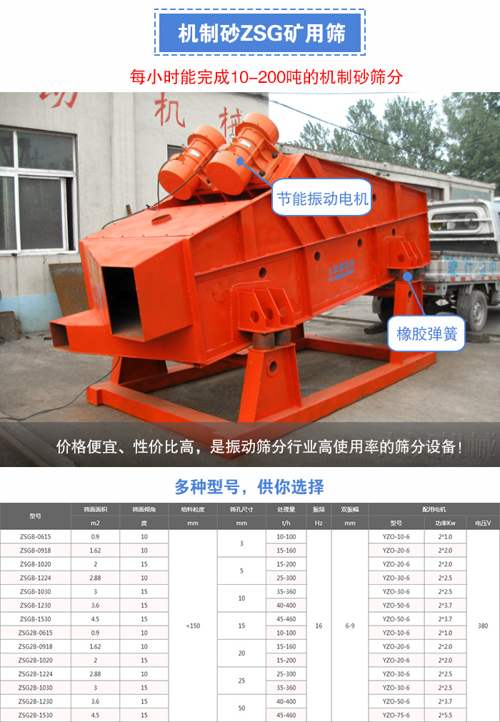 ZSG礦用振動篩是我公司自主研發得一種新型,高效的篩分設備,主要用于冶金,礦山,煤炭,建材等大規模生產線使用。每小時能完成10-200噸的機制砂篩分,采用能耗低振動電機作為振動源,橡膠彈簧支撐并隔振,處理量大篩分效率高,篩網有較大的安裝傾角,拼塊,更換方便,使用壽命長。